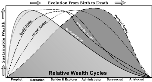 Miller notes that organisations in the Administrator phase are often at their most wealthy during this period, especially in financial terms (see graph below). He states, “During this period the financial assets are growing, brand equity is increased, and human capital is increasing with the capacity to produce. It is likely that spiritual capital is the first resource that will decline during this period, followed by the loss of innovation and then internal sociability and trust. These losses are the leading indicators of decline”.
