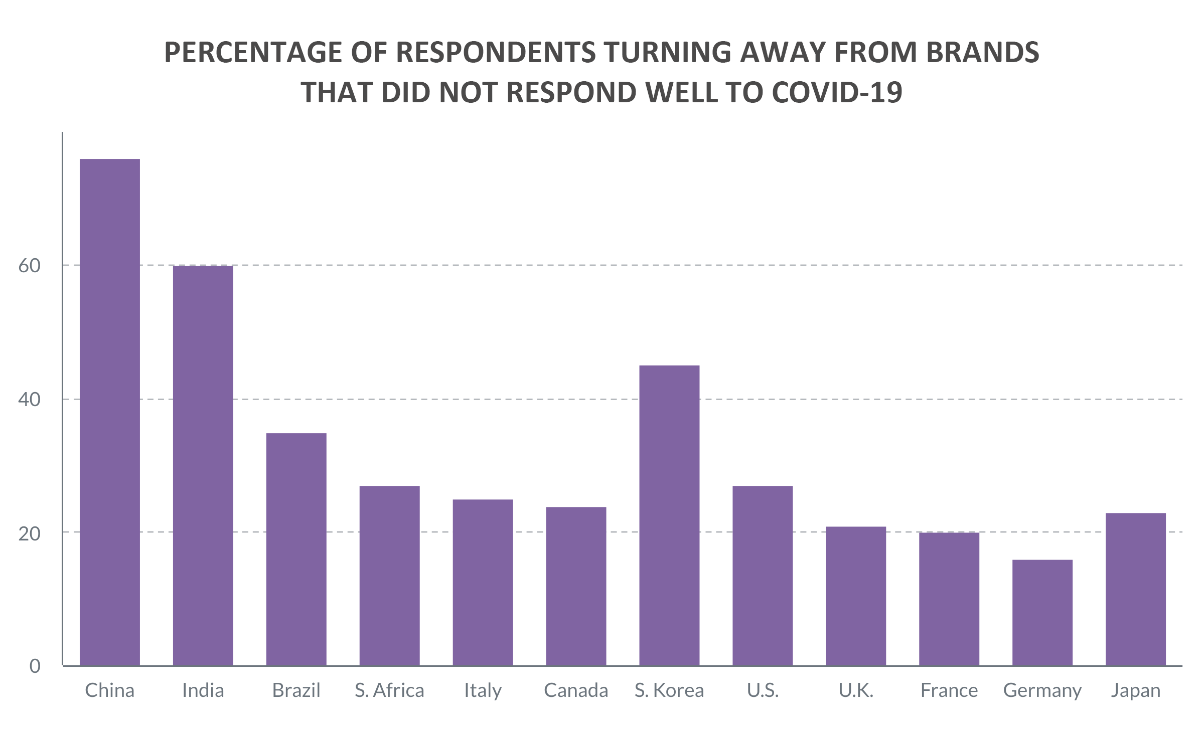 Being a trusted brand is not enough. Consumers increasingly make decisions around how brands behave during times of crisis. Edelman’s survey found that 88% of Chinese consumers and 65% globally believe that how brands respond to the pandemic will have a "huge impact" on their likelihood to buy that brand in the future. Consumers are quick to punish brands that do not respond well. 75% of consumer surveyed in China have already stopped using a brand because they felt it was not acting appropriately in response to the pandemic.