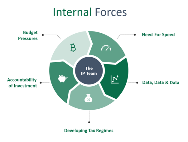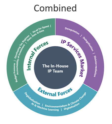 Our starting point is where in-house IP teams were heading as we entered this decade and what forces were driving this. We consider those from three perspectives: internal forces within the business; the forces acting on the IP service provider market, such as deregulation and disintermediation; and, finally forces external to the business such as geopolitical, macroeconomic and technological forces.