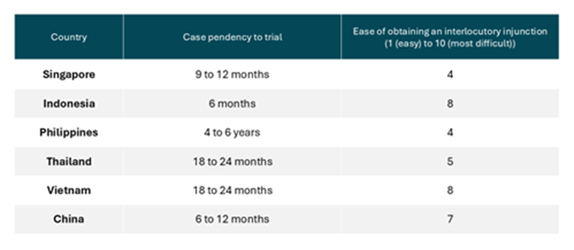 The common theme (except for Indonesia) is that the court will need to consider a ‘balance of convenience’ assessment to determine which party will suffer greater harm from the interlocutory injunction. However, each country may articulate this requirement differently and vary its application—some leaning towards the status quo meaning no injunction is granted. At the back of the judge’s mind is case pendency— – the greater the delay, such as in the Philippines, the greater the harm to the plaintiff if interlocutory injunction is not granted.