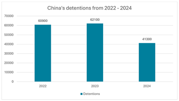 While the above data sources do not include China detentions, according to its own published statistics, China’s Customs General Administration reported 60,900 detentions in 2022, 62,100 in 2023 and 41,300 in 2024, which makes it the highest-ranked globally. China detentions are predominantly exports, given its role as the primary source of infringing products.
